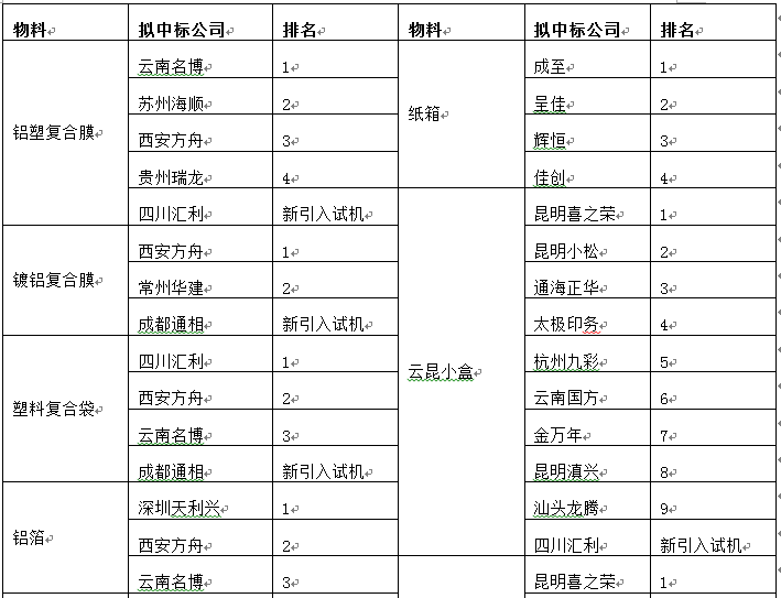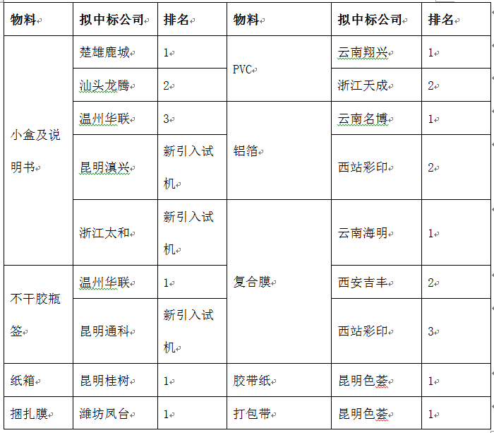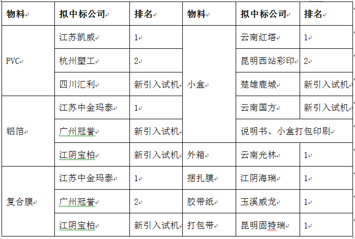3、在新供应商试机期间,原供应商按照最终确认的报价继续供货,直至新增供应商试机合格后,按照报价排名执行分单比例。印刷类外包材试机请在3月31日前完成。